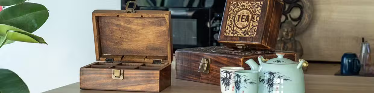 Ces boîtes de rangement pour le thé sont fabriquées à la main par des artisans qualifiés en Inde, en utilisant du bois de manguier durable, connu pour sa durabilité et son beau grain unique.