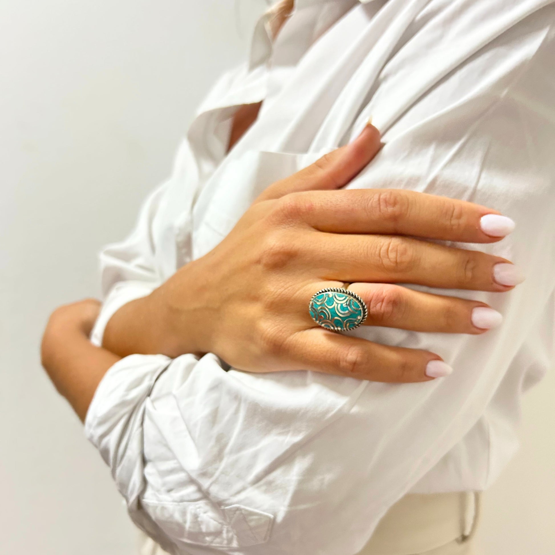 Ces bagues sont disponibles en quatre couleurs différentes, offrant une polyvalence unique pour s'adapter à toutes les occasions et à toutes les humeurs. Réalisées avec le plus grand soin, elles se distinguent par leur forme ovale et leurs motifs complexes qui leur confèrent un caractère unique. Chaque pièce est le reflet de l'artisanat népalais, reconnu dans le monde entier pour sa qualité et sa beauté.