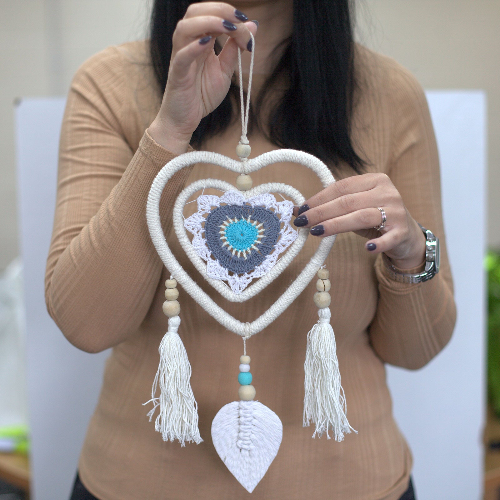 L' attrape-rêves cœur bleu moyen est une œuvre d'art conçue pour capturer vos rêves et décorer avec élégance n'importe quel espace de votre maison. Cette pièce unique, avec son cœur bleu captivant en son centre, vous invite à entrer dans un univers de tranquillité et de couleurs.