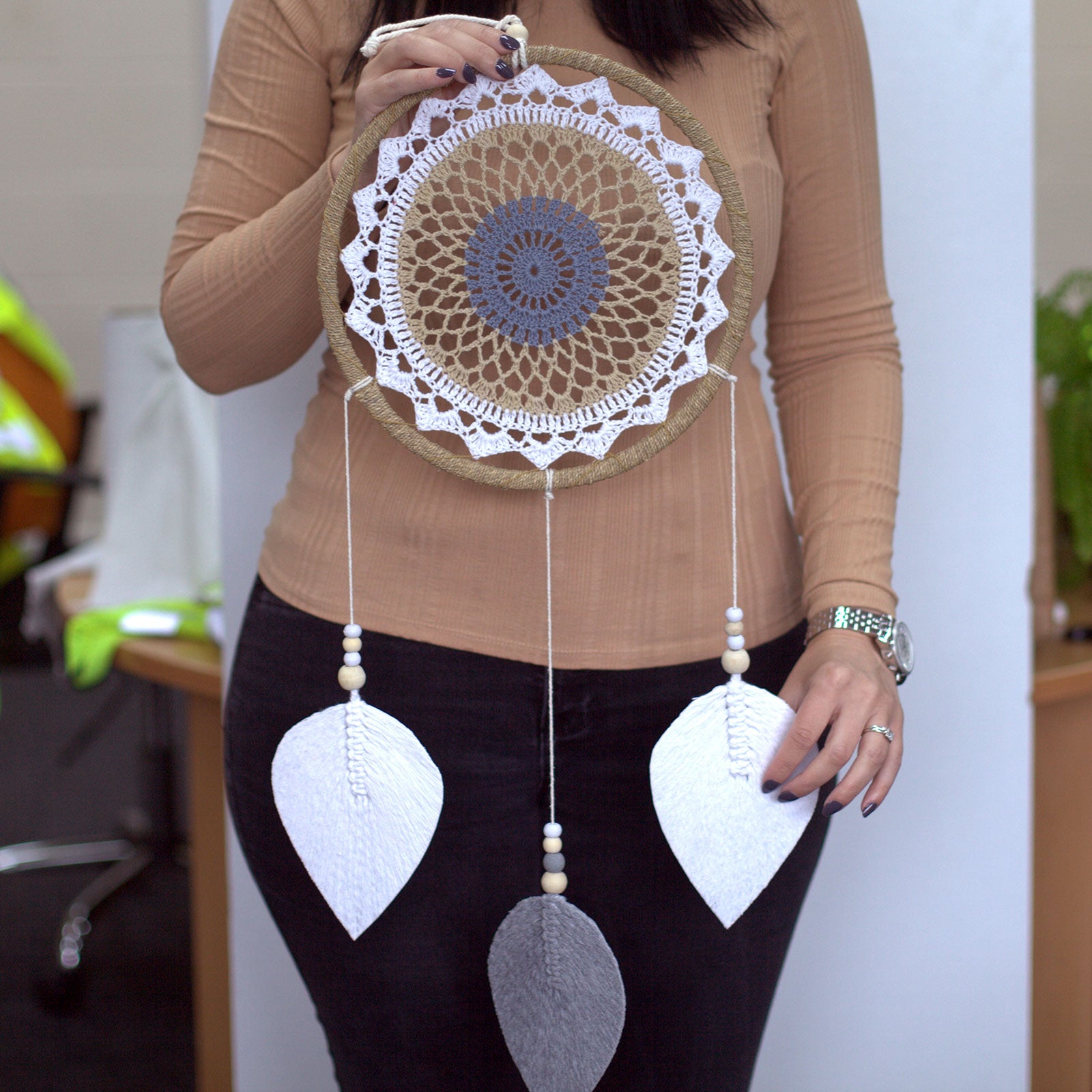 L' attrape-rêves – Éléments brun moyen est le cadeau idéal pour ceux qui apprécient les histoires et les traditions des objets, ou tout simplement pour ceux qui souhaitent embellir leur intérieur avec des détails qui parlent au cœur. Faites-en le gardien de vos rêves et l'emblème d'un style unique dans votre décoration.