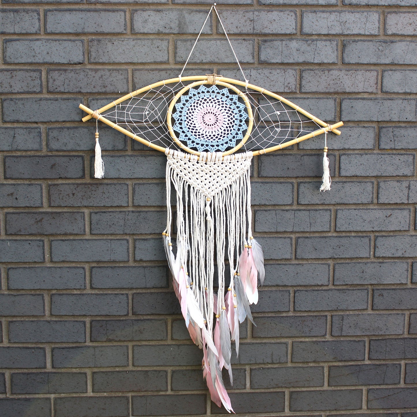 Découvrez le charme et la magie du grand attrape-rêves en macramé avec œil bleu/blanc/rose, qui embellira n'importe quelle pièce de votre maison. Fabriqué selon la technique ancestrale du macramé, ce magnifique ornement allie tradition et design contemporain pour créer une pièce unique qui attire tous les regards. Sa grande taille en fait un élément central de votre décoration, apportant chaleur et une touche bohème.