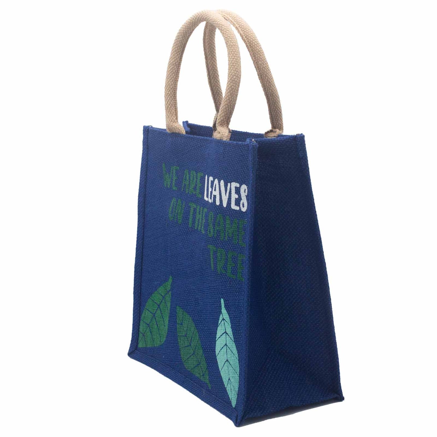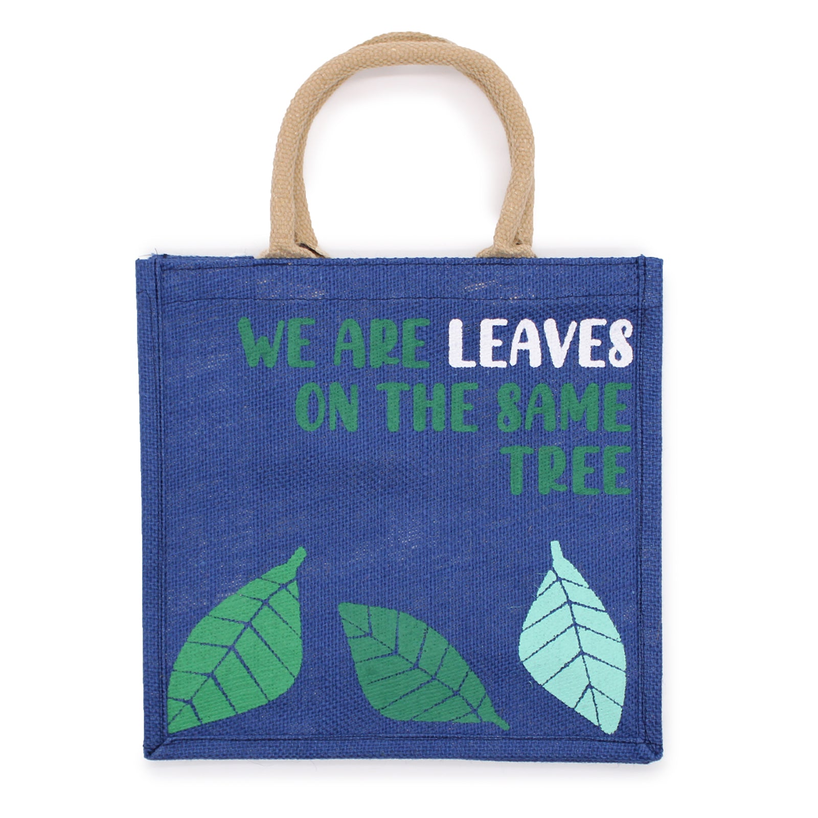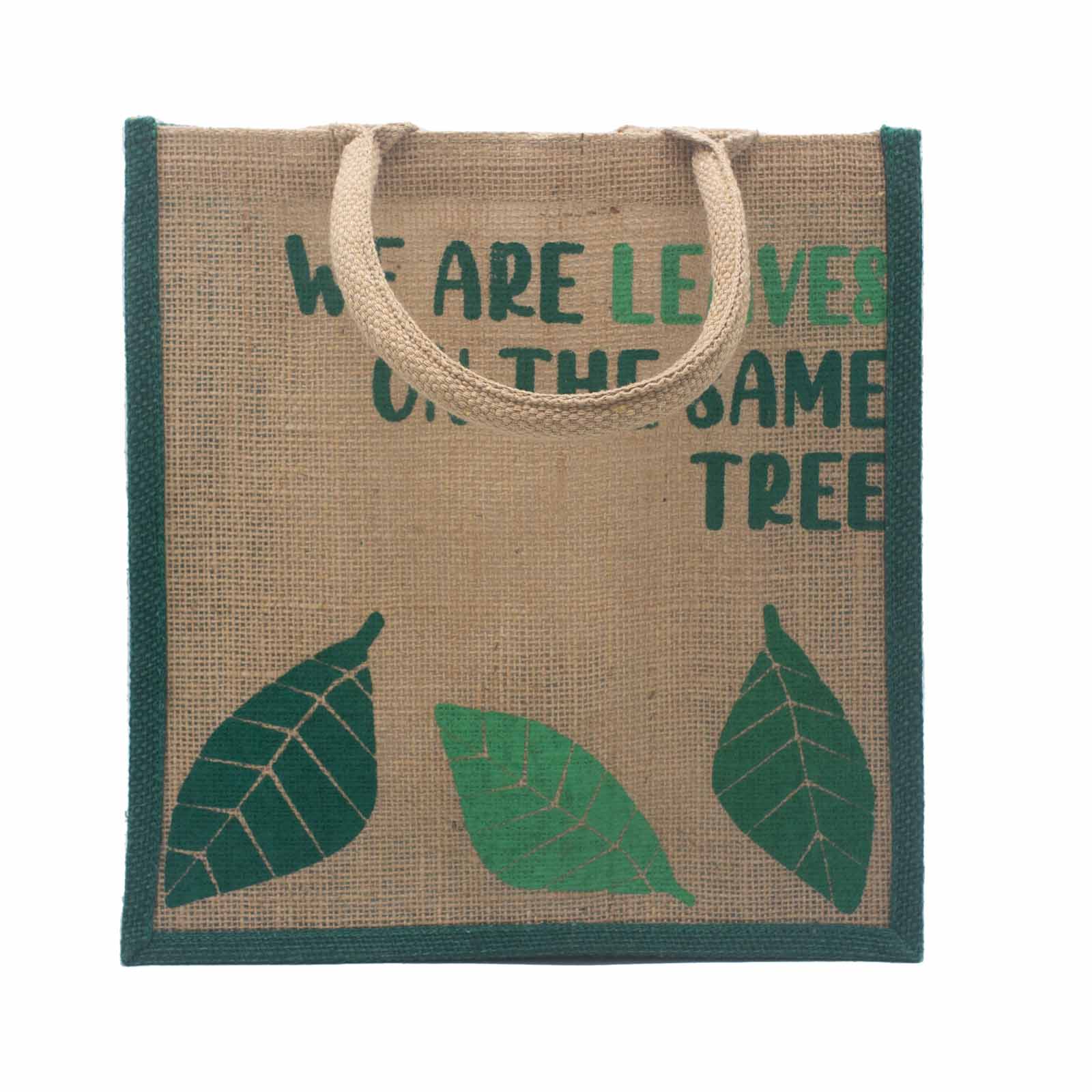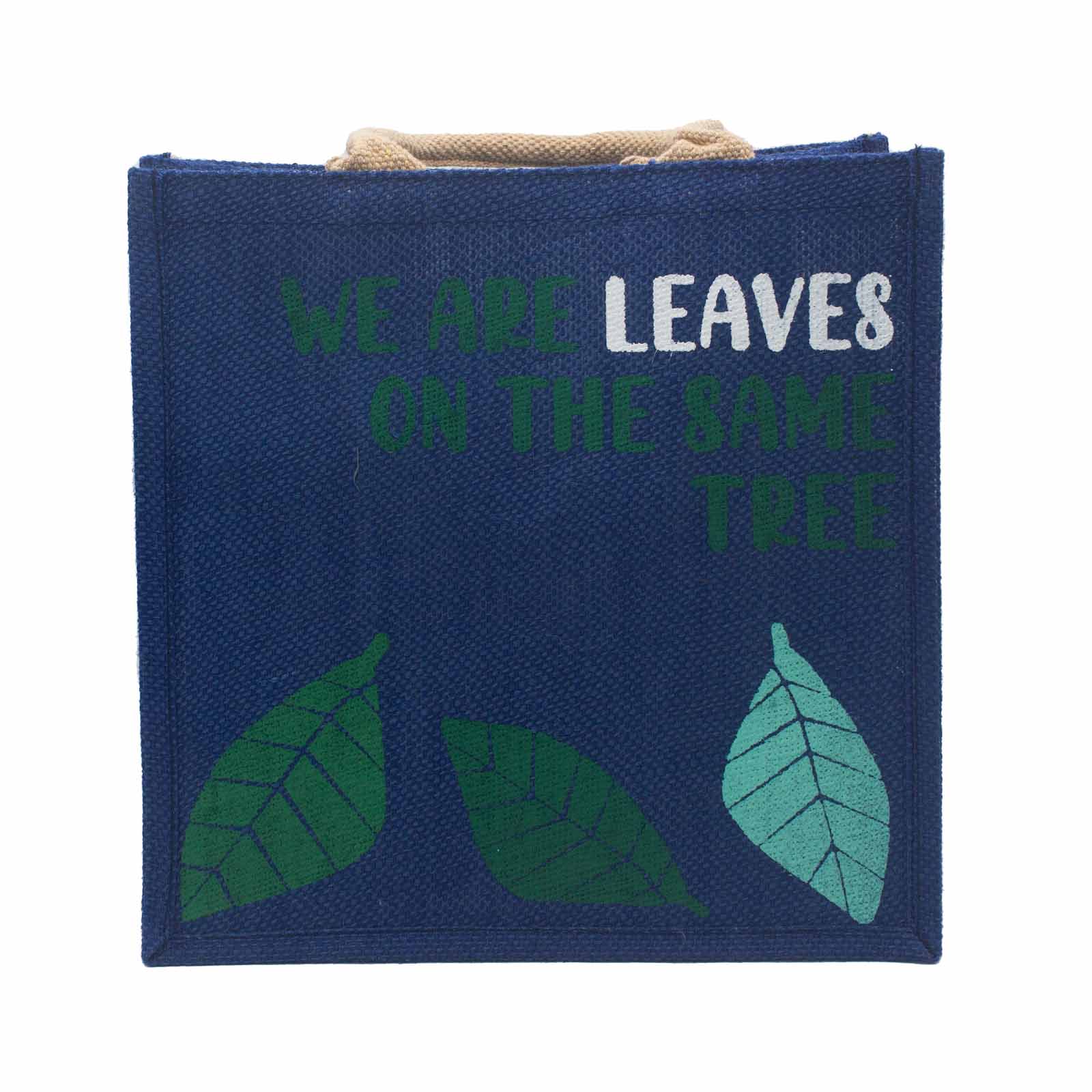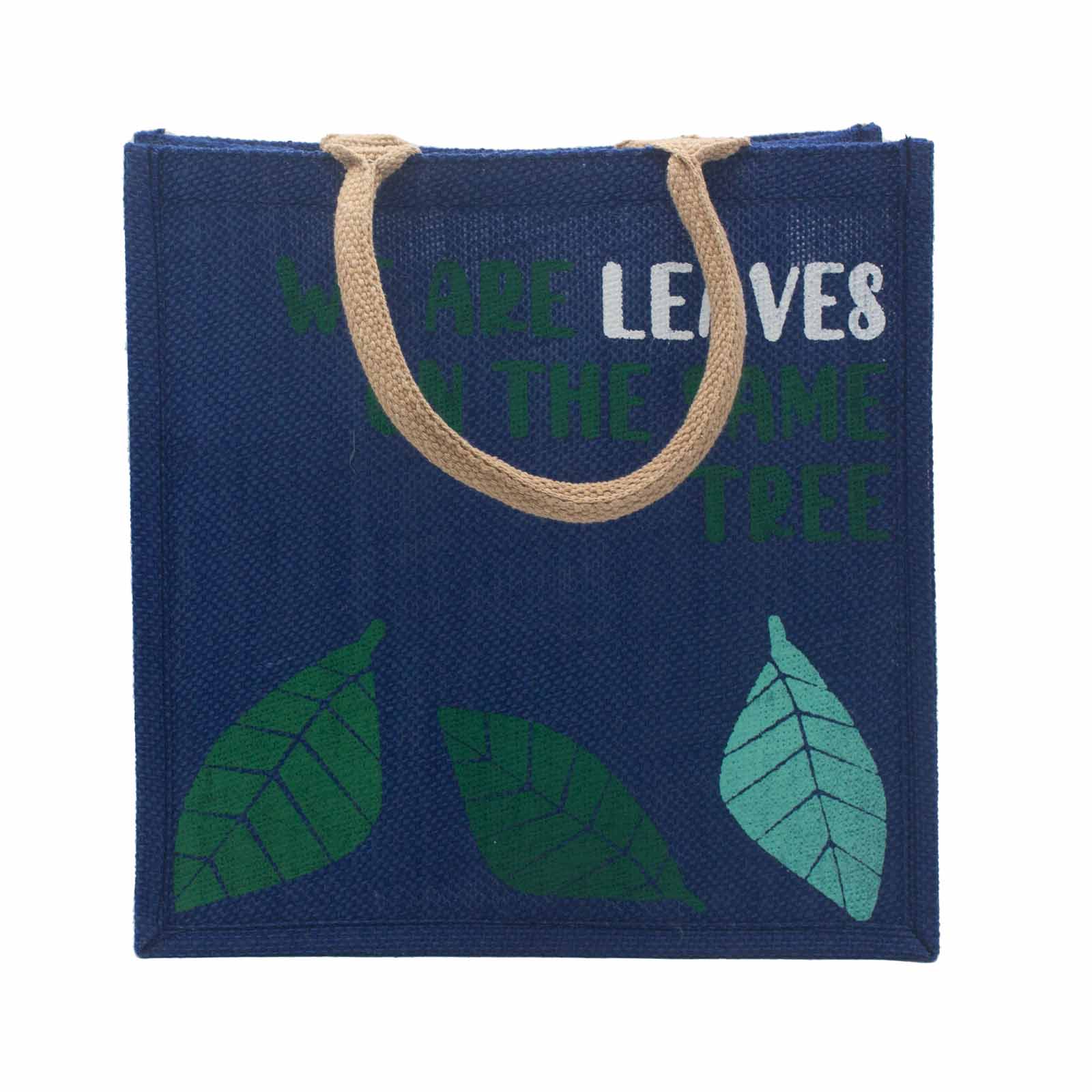 Sac en jute imprimé - Nous sommes des feuilles - Jaune, Bleu et Naturel