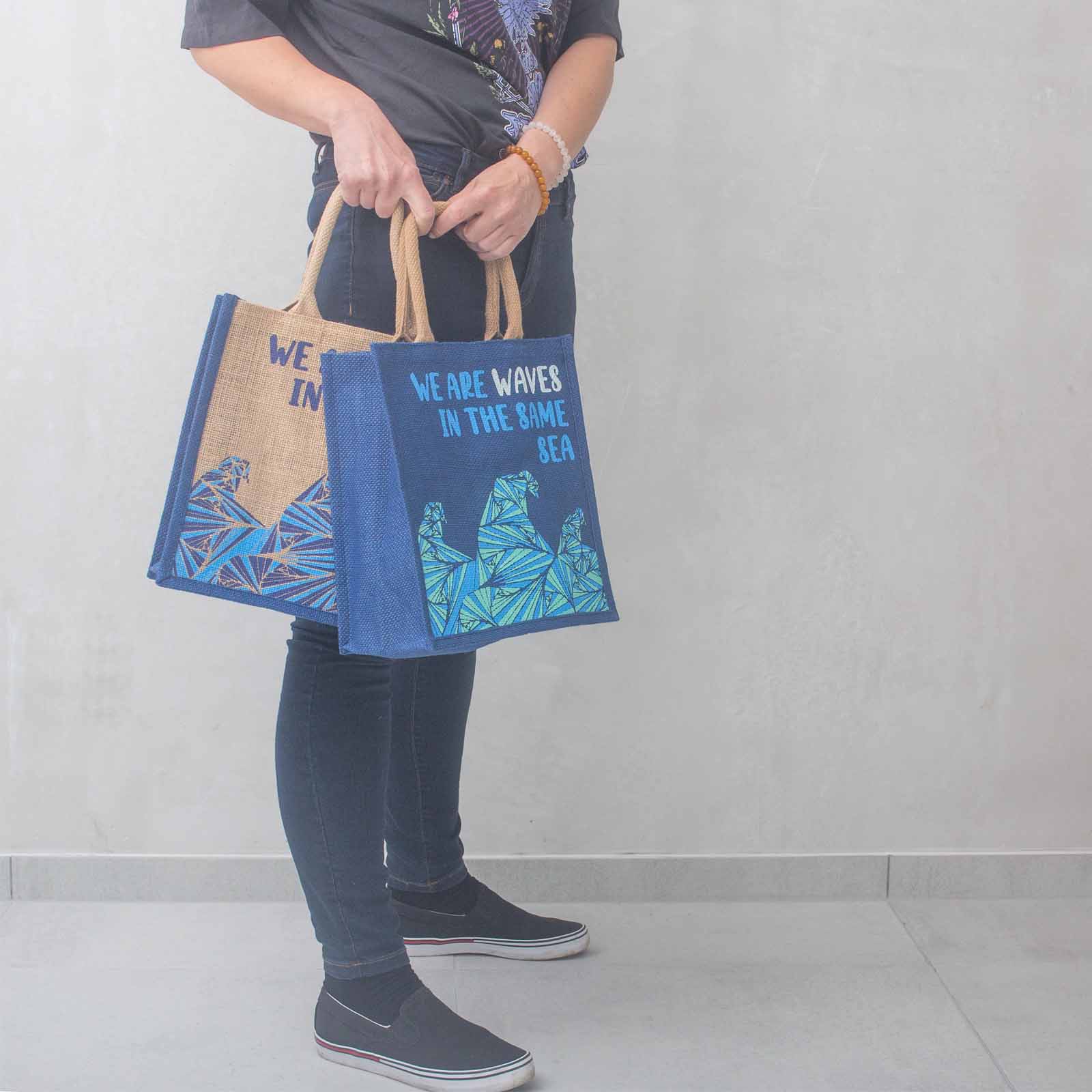 Optez pour le sac en jute imprimé « We Are Waves » (gris, bleu et naturel) et emportez un morceau d'océan avec vous, tout en démontrant votre engagement pour un mode de vie plus durable. Cet accessoire est non seulement utile à vous, mais aussi à la planète.