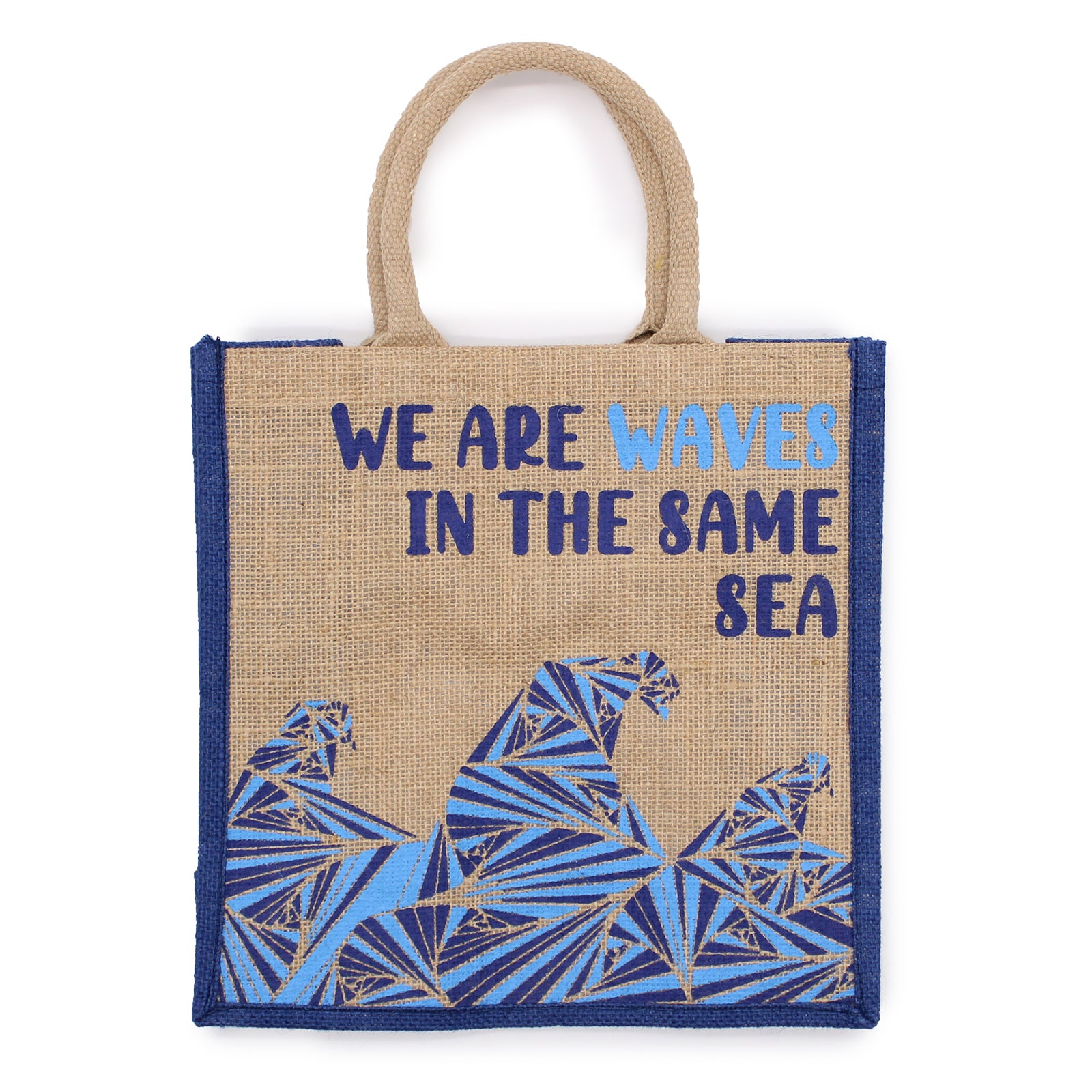 Sac en jute imprimé - We are waves - Gris, Bleu et Naturel