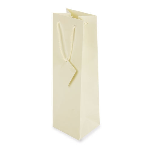 Sac cadeau en papier laminé, disponible en quatre couleurs : noir, blanc foncé, argent et blanc cassé.
