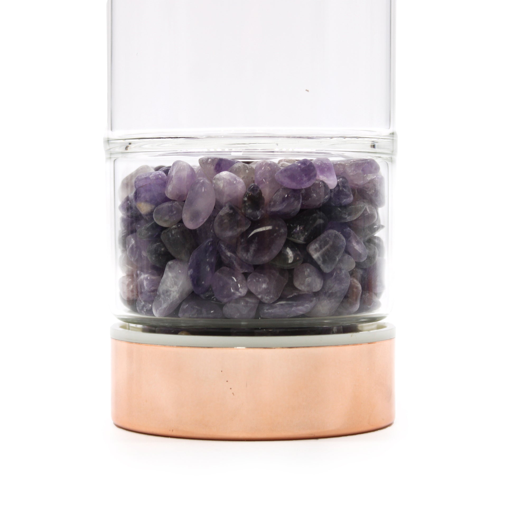L'alliance de la fonctionnalité et de l'esthétique transparaît dans chaque détail, du bouchon couleur or rose à l'inclusion d'une améthyste, reconnue pour ses propriétés apaisantes et purifiantes. Ce flacon est le cadeau idéal pour celles et ceux qui recherchent un équilibre entre bien-être et sophistication. Utilisez-le comme un rappel quotidien pour prendre son temps, savourer les petites choses et prendre soin de son bien-être avec style et élégance.