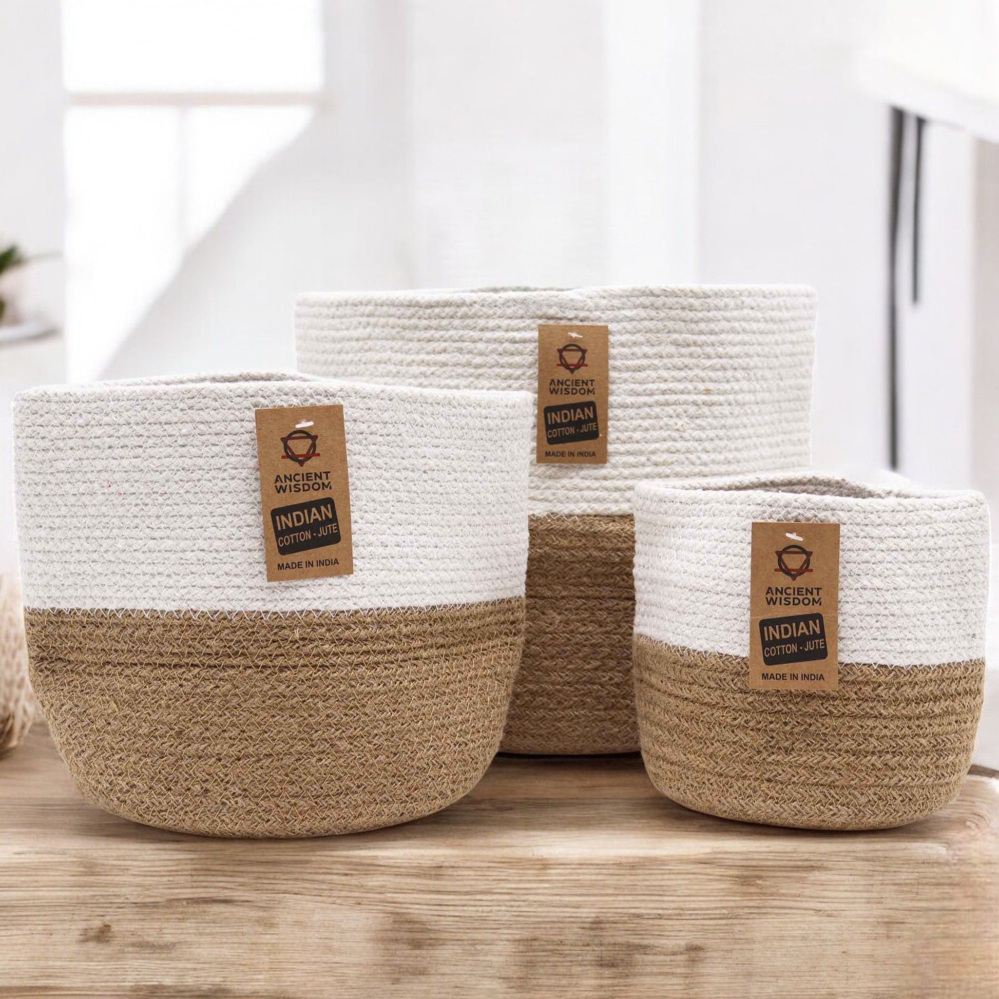 Grand panier en coton et jute 25x25cm Blanc