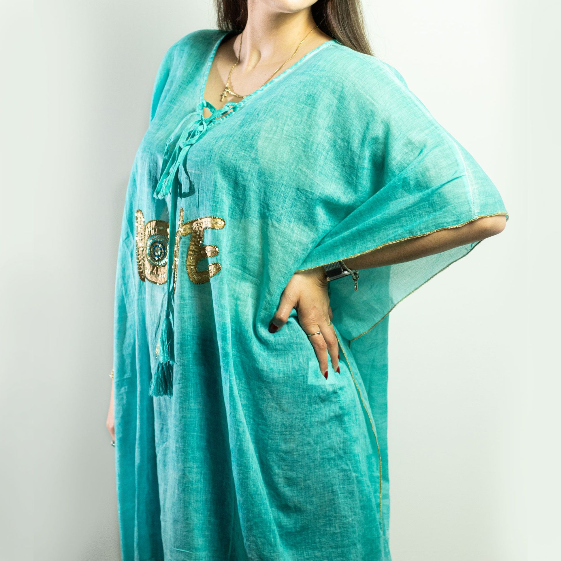 Collection Nomad : sari méditerranéen – caftan – motif cœur turquoise et or