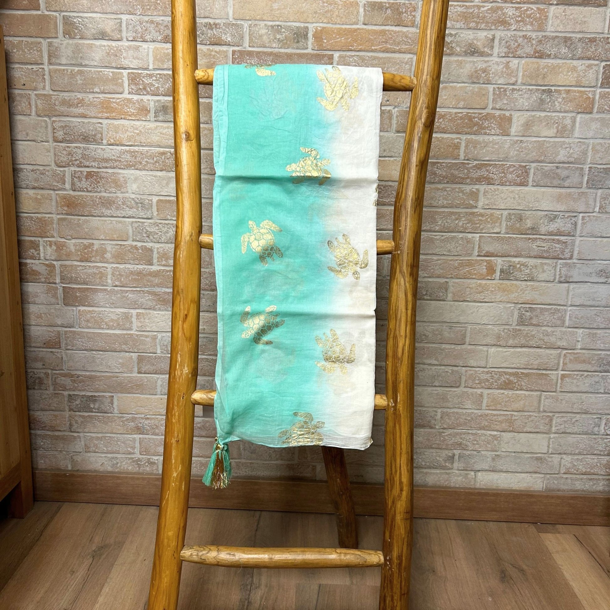 Collection Sari Nomad Méditerranéen - Sarong - Motif Tortue en Blanc, Turquoise et Or