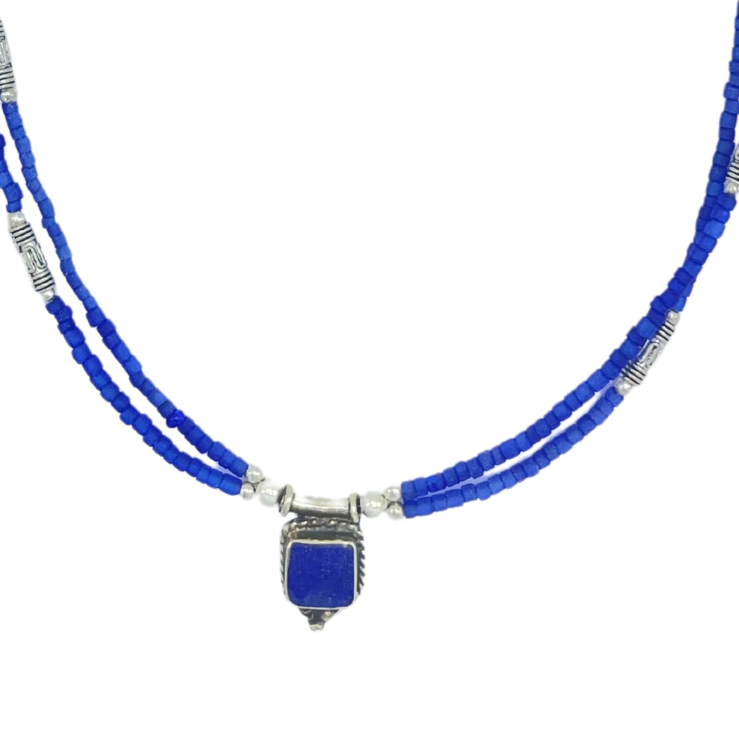 Collier népalais extra-fin à deux rangs - Pendentif en onyx bleu et lapis-lazuli