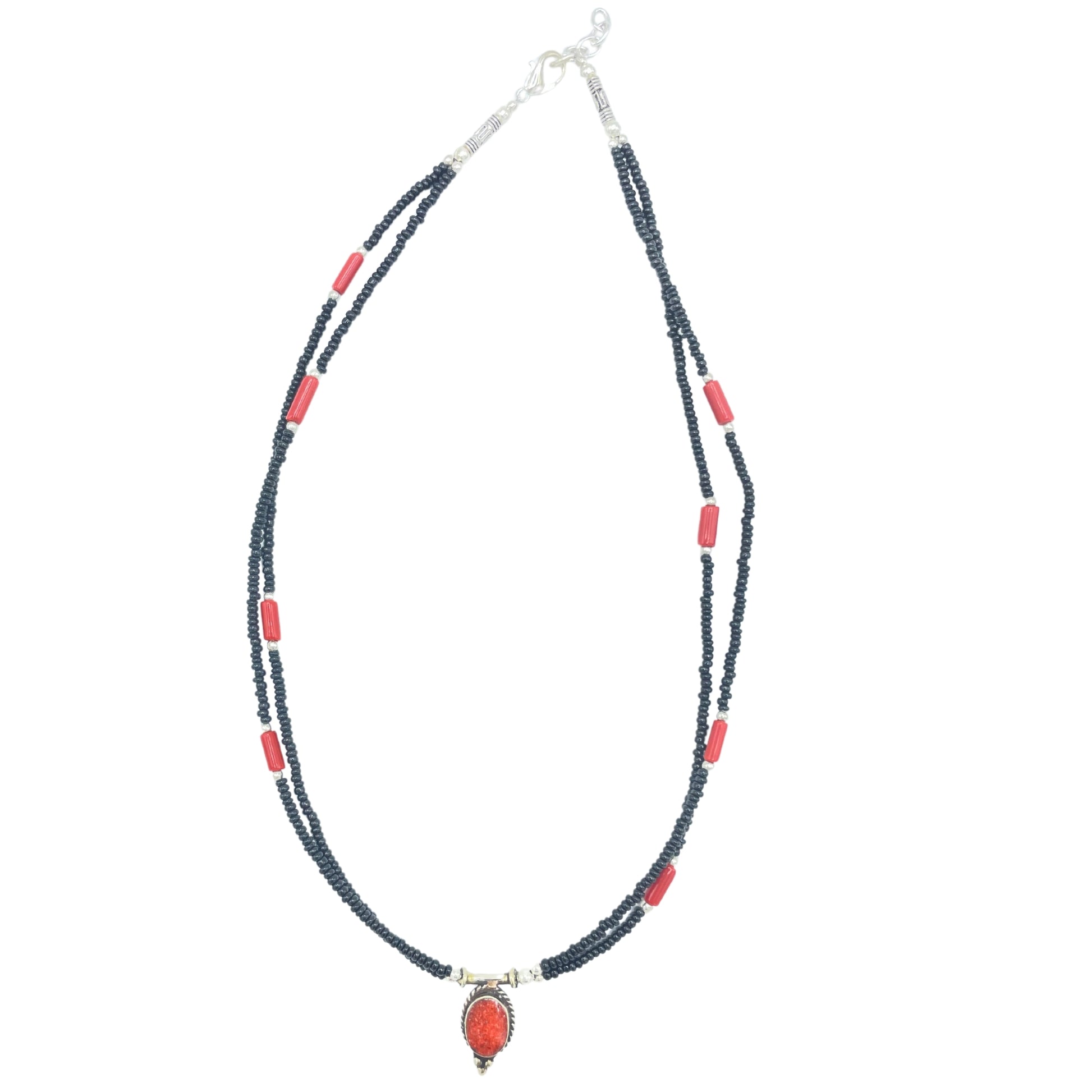 Collier népalais extra-fin à deux rangs - Pendentif noir et corail