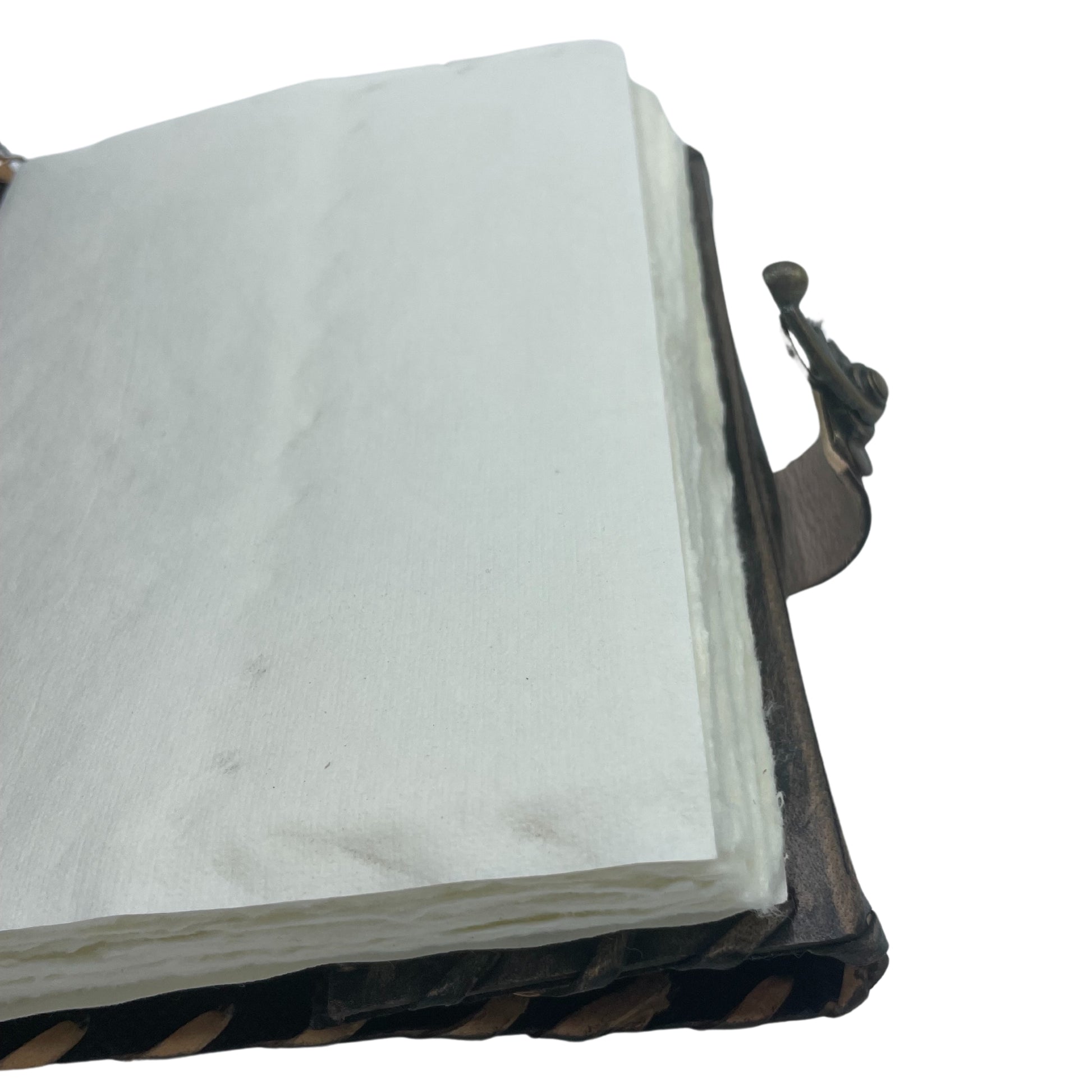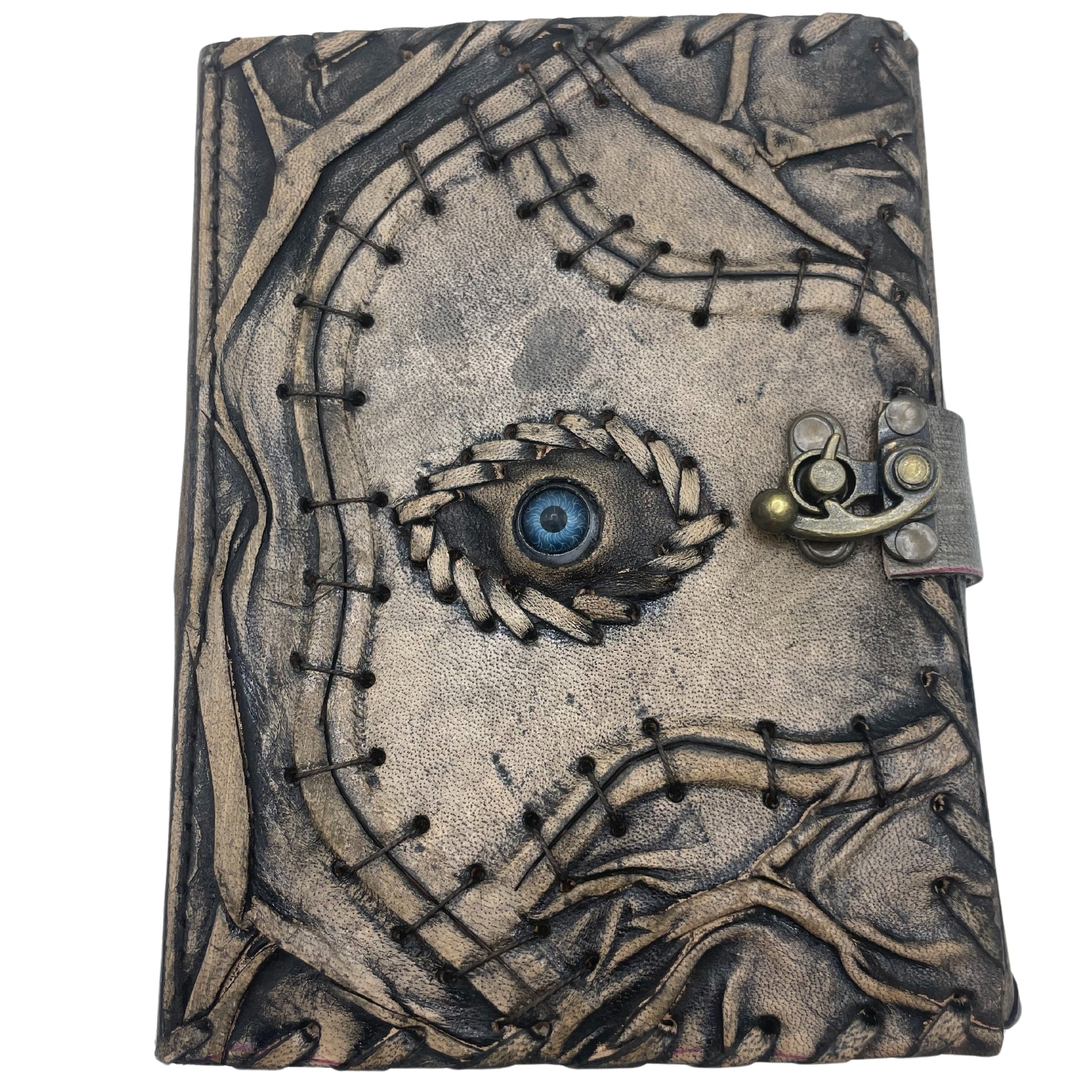 - Couverture en cuir marron avec un mauvais œil gravé sur la couverture