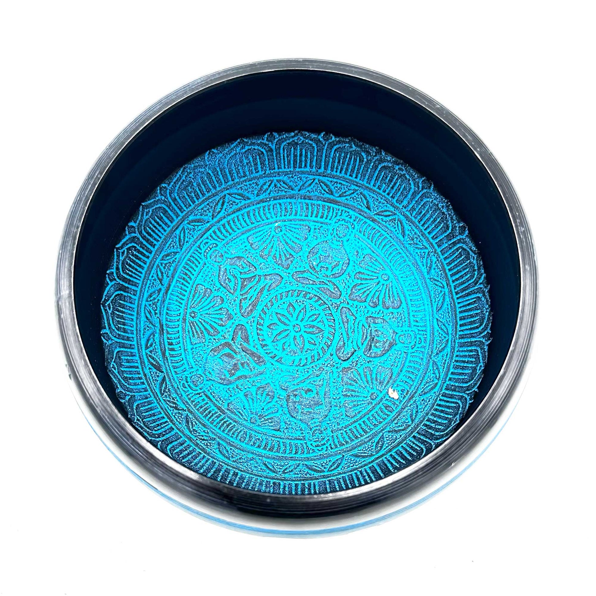 Bol chantant tibétain en poudre de terre - Mantra des cinq Bouddhas bleu - 16 cm