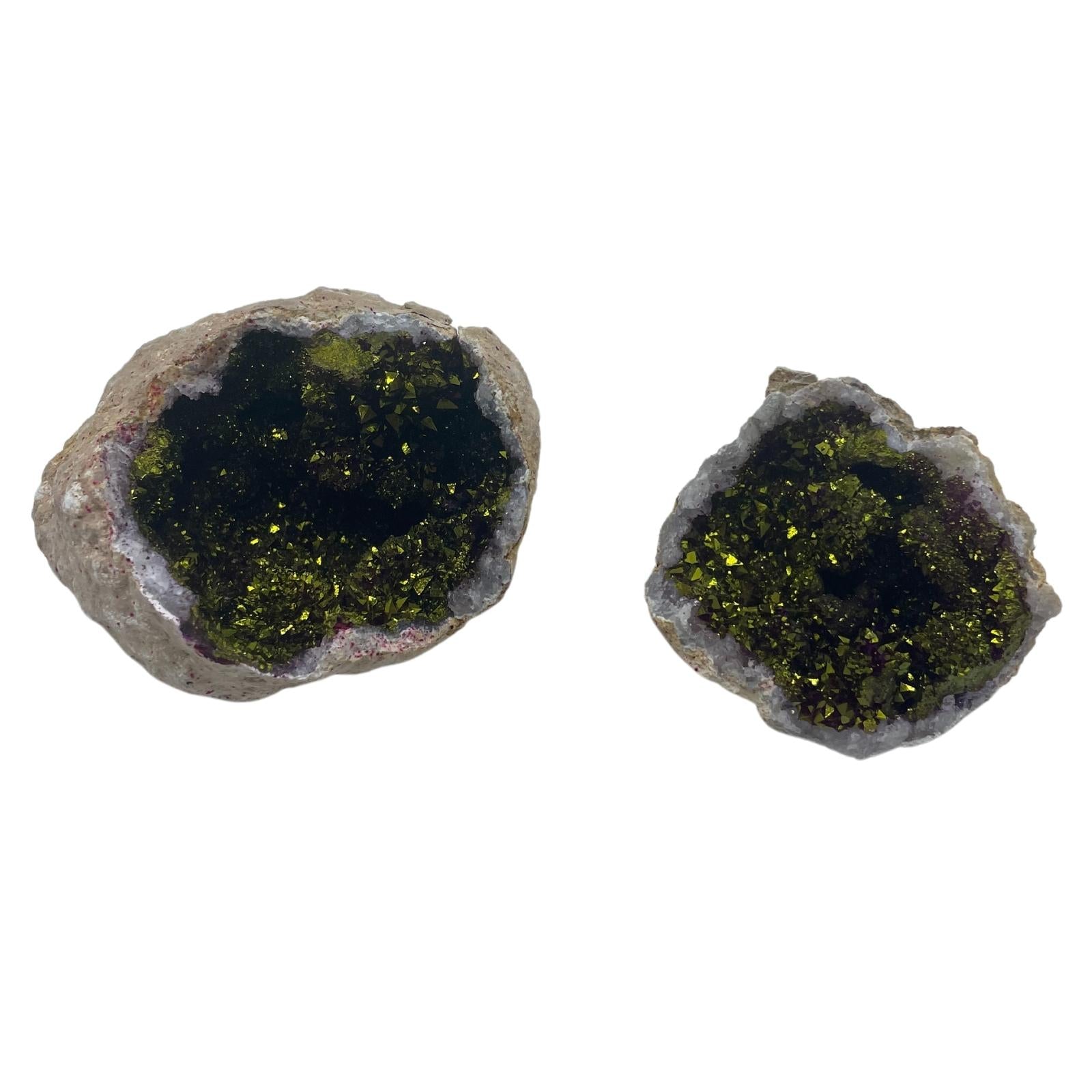 Parfaites comme éléments décoratifs, ces géodes peuvent être placées dans les espaces de travail pour stimuler la créativité, dans les salons pour une touche sophistiquée, ou même dans les chambres comme symbole de calme et de détente. Leur éclat naturel attire la lumière, créant des reflets et des ombres captivants qui sublimeront n'importe quel environnement.