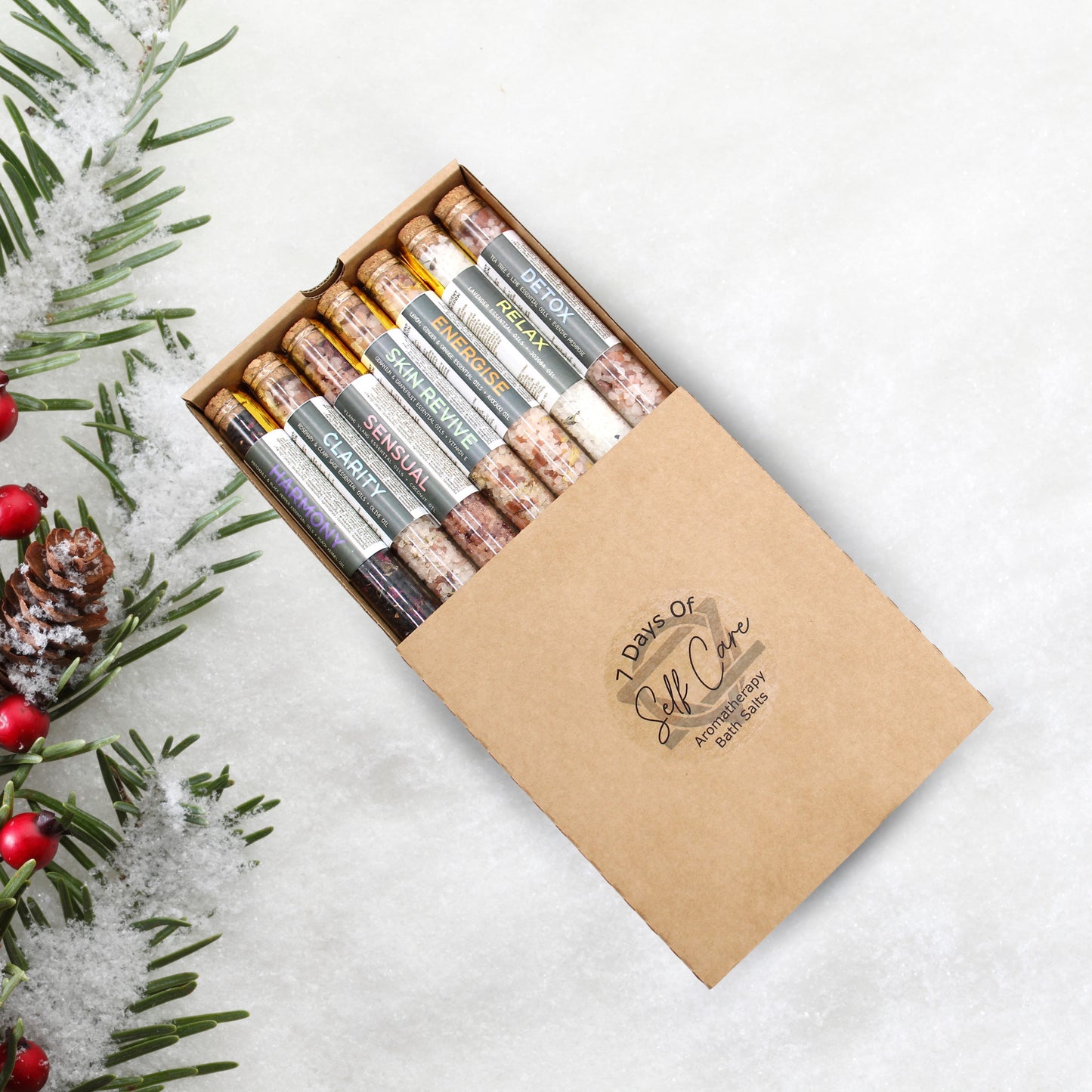 - Pack de 7 tubes de sels de bain, chacun conçu pour un jour de la semaine spécifique. Ces tubes contiennent des sels aromatiques aux propriétés relaxantes et rajeunissantes, parfaits pour créer un rituel de soins quotidien.
