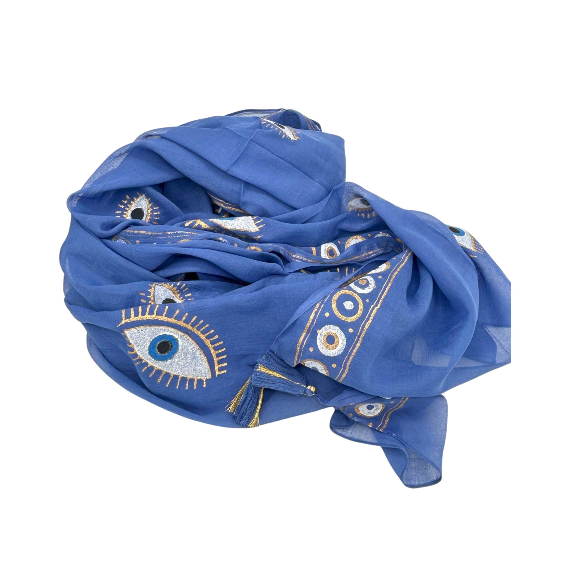 - Pareo con diseño Ojo Maligno en azul rico y dorado, perfecto para la playa o un look casual