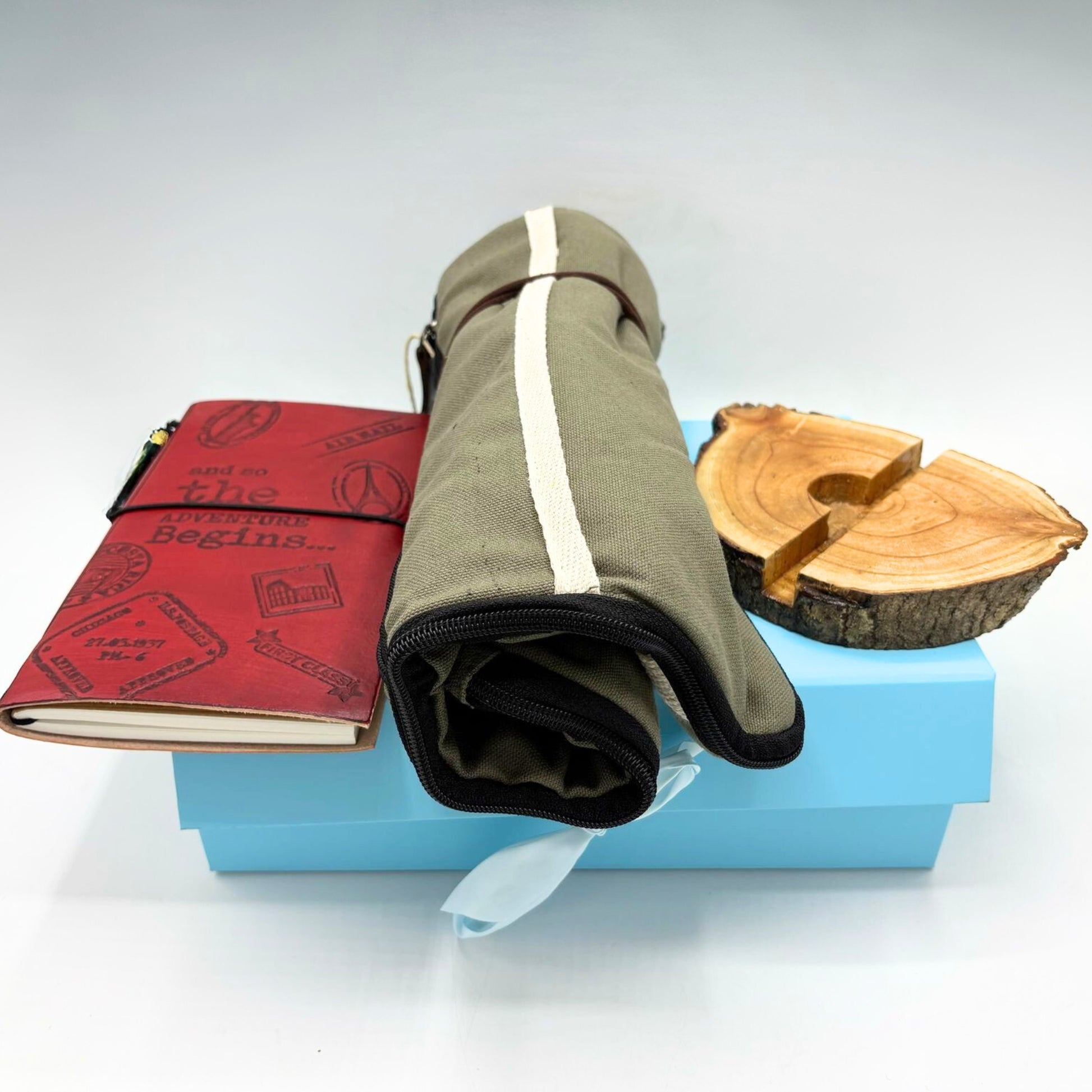 Ce sac est conçu pour les personnes modernes, toujours en déplacement. Le support de téléphone en bois naturel est idéal pour passer des appels vidéo ou regarder du contenu sans avoir à tenir son téléphone. Le journal en cuir fait main est parfait pour ceux qui aiment noter leurs pensées ou planifier leurs objectifs. La housse pour ordinateur portable en toile olive est l'accessoire idéal pour protéger votre ordinateur ou votre tablette avec style, que ce soit en voyage ou en ville.