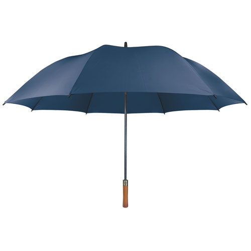 Parapluie à bouton-poussoir avec poignée en bois et tissu imperméable. Disponible en bleu marine, noir et pierre.