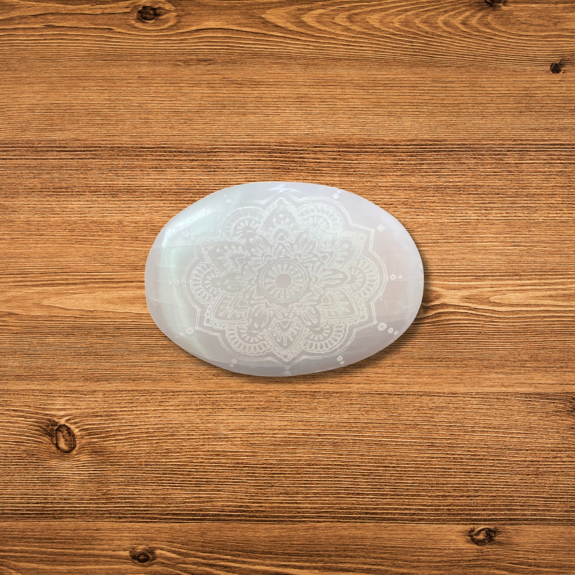 La sélénite, reconnue pour ses propriétés apaisantes et purifiantes, est sublimée par le symbolisme sacré du mandala gravé sur cette pierre de paume. Placez-la dans votre espace de méditation, sur votre autel ou gardez-la simplement à proximité pour profiter de ses bienfaits. Le mandala, avec ses motifs complexes, ajoute une touche visuelle captivante à la pierre, en faisant une expression artistique du lien entre pureté et spiritualité. Laissez la pierre de paume en sélénite avec mandala gravé inspirer votre connexion spirituelle et embellir votre environnement par sa présence significative.