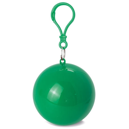 Porte-clés original en forme de boule, contenant un poncho de pluie bleu pliable. Diamètre de la boule : 65 mm, dimensions du poncho : 120 x 90 cm.