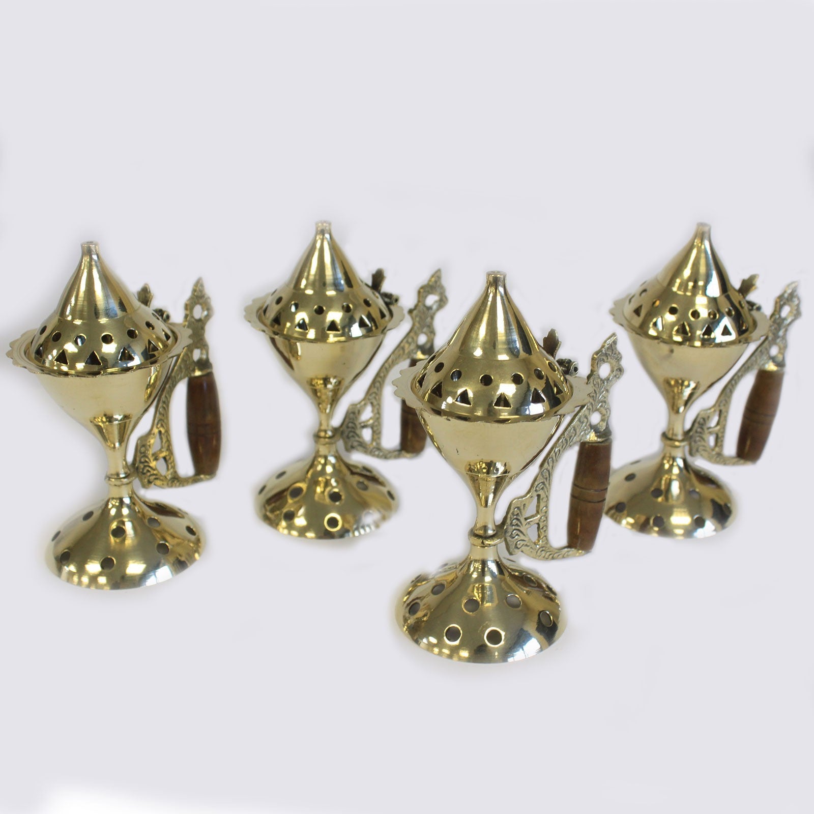 100 % laiton massif et magnifiquement travaillés. Les brûle-encens sont dotés d'une poignée en bois amovible pour faciliter le transport et le transport de l'encens d'une pièce à l'autre.