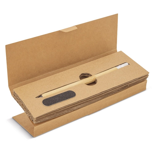 Coffret en carton recyclé composé d'un crayon infini, en bambou avec une gomme sans résidus et une lime pour aiguiser la pointe et la garder comme neuve.
