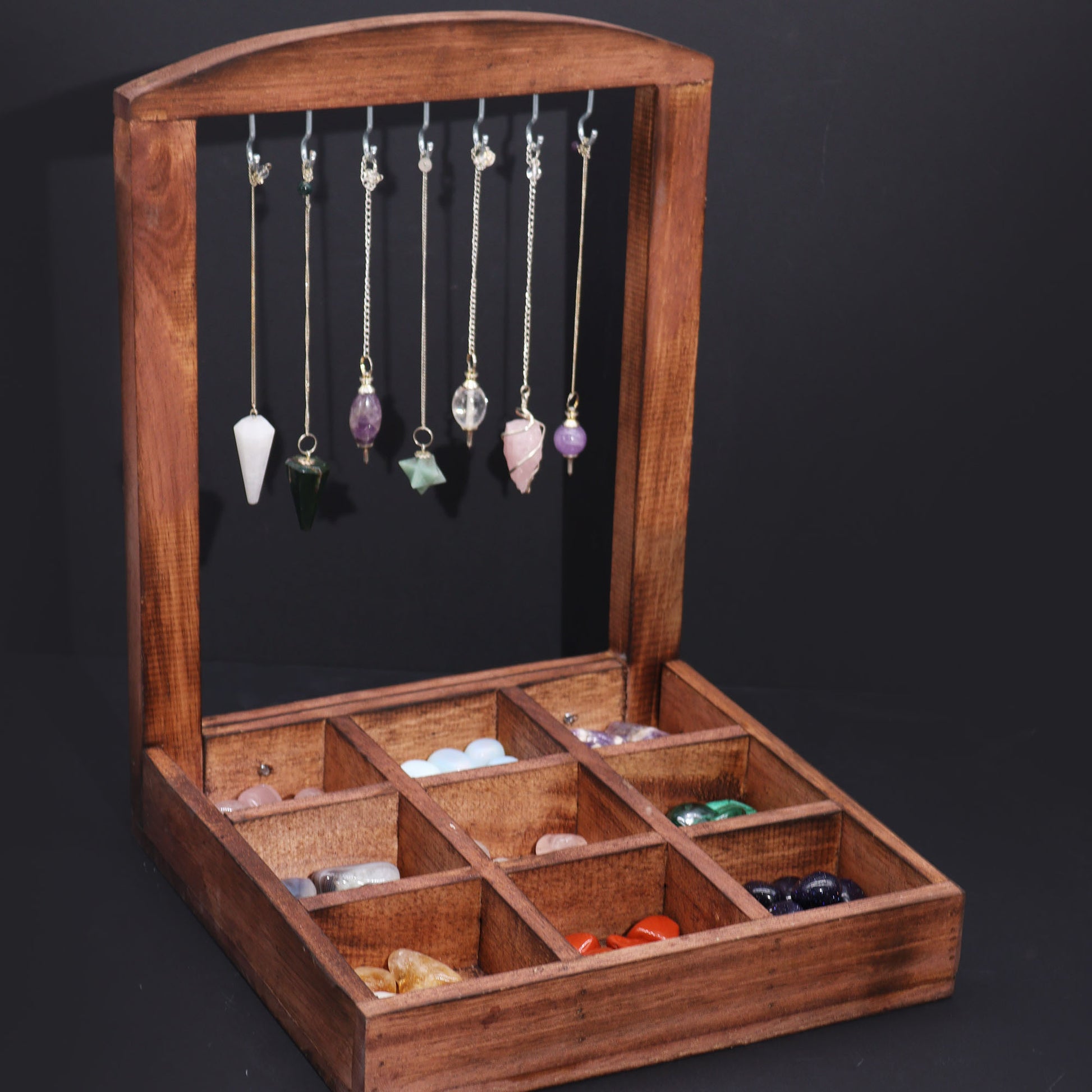 Avec ses neuf compartiments disposés en 3x3, il offre l'espace idéal pour ranger bijoux, pierres précieuses, minéraux, petites œuvres d'art et objets décoratifs. Sa conception permet de l'accrocher au mur, optimisant ainsi l'espace vertical et apportant une touche unique à votre décoration intérieure ou de bureau. De plus, le plateau intégré en bas offre un espace de rangement supplémentaire, idéal pour les objets que vous préférez garder à portée de main ou mettre en valeur.