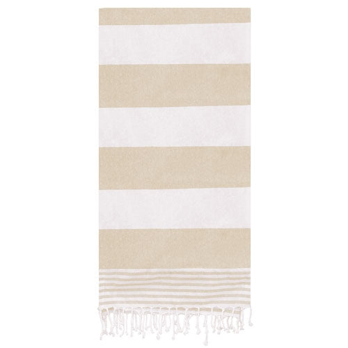 Découvrez notre nouvelle collection de paréos, déclinés dans une grande variété de couleurs pour une adaptation parfaite à l'image de votre entreprise. Imaginez le logo de votre entreprise étalé sur le sable d'une plage paradisiaque ou au bord d'une piscine luxueuse. Le paréo en éponge « Cala Bonita » (T-269) est 100 % coton à l'extérieur et arbore un motif rayé disponible en gris et rouge-bleu. Son intérieur est en éponge 100 % polyester. Les franges tressées aux extrémités apportent une touche originale et contemporaine.