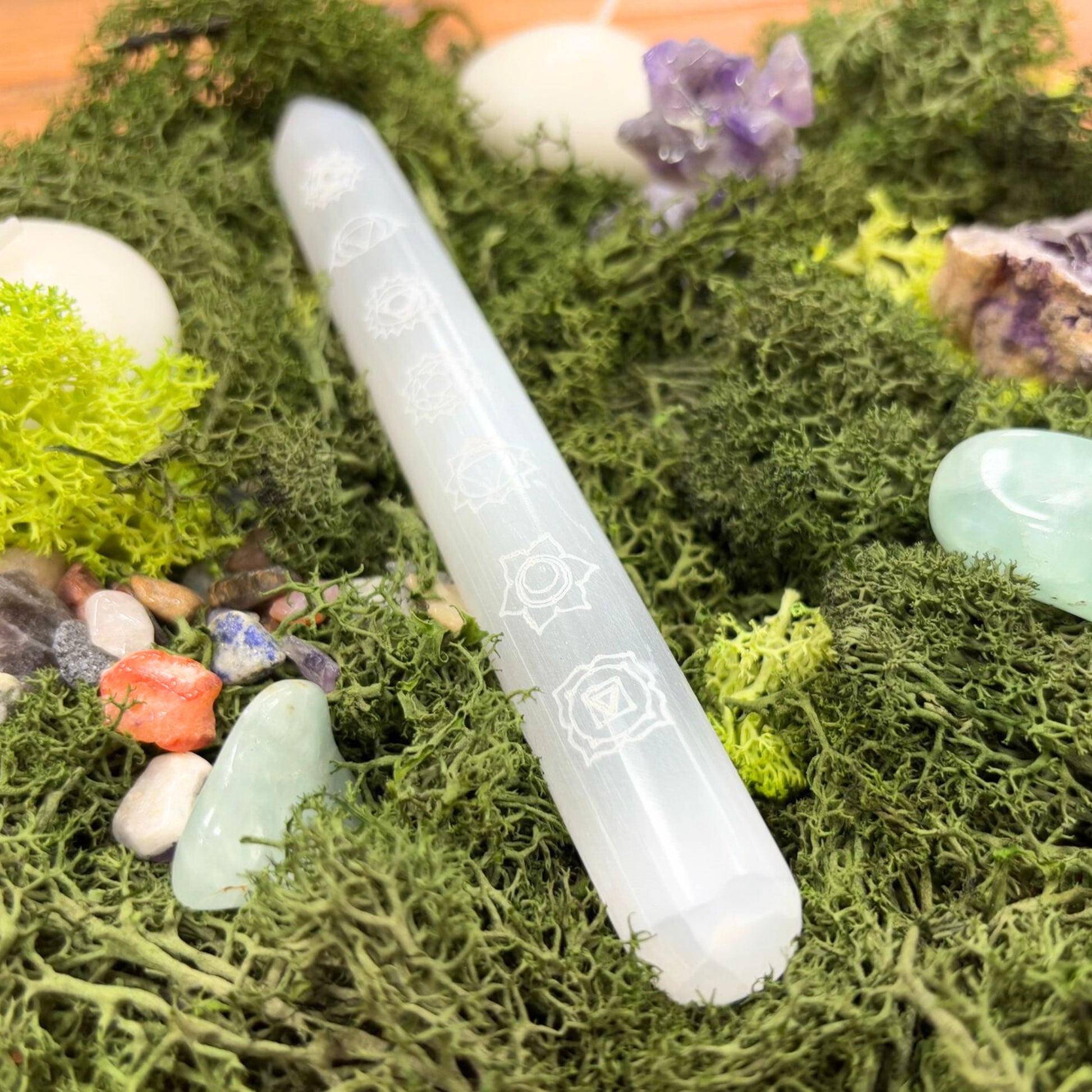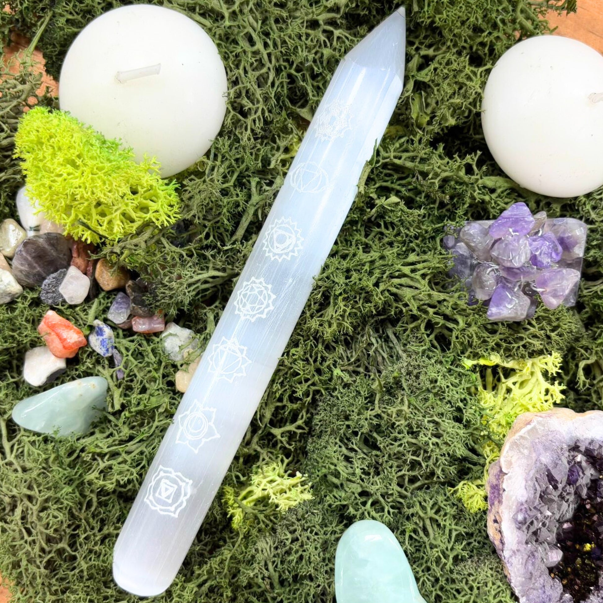 Baguette de sélénite - 16 cm (une extrémité) 7 Chakra