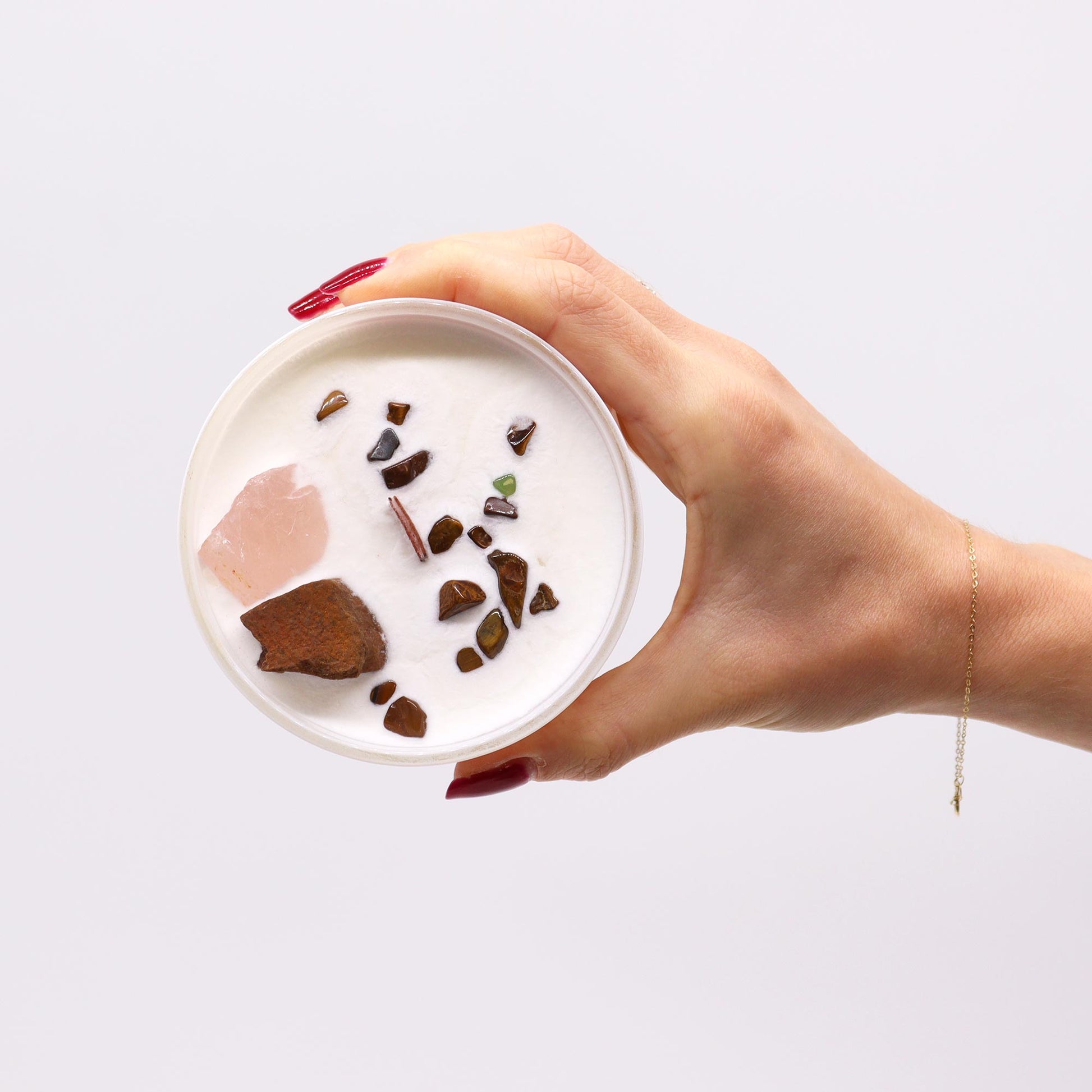Notre bougie Chakra Sacré est fabriquée avec de véritables pierres précieuses, notamment l'œil de tigre et le quartz rose, sélectionnées pour leurs propriétés énergétiques et curatives.