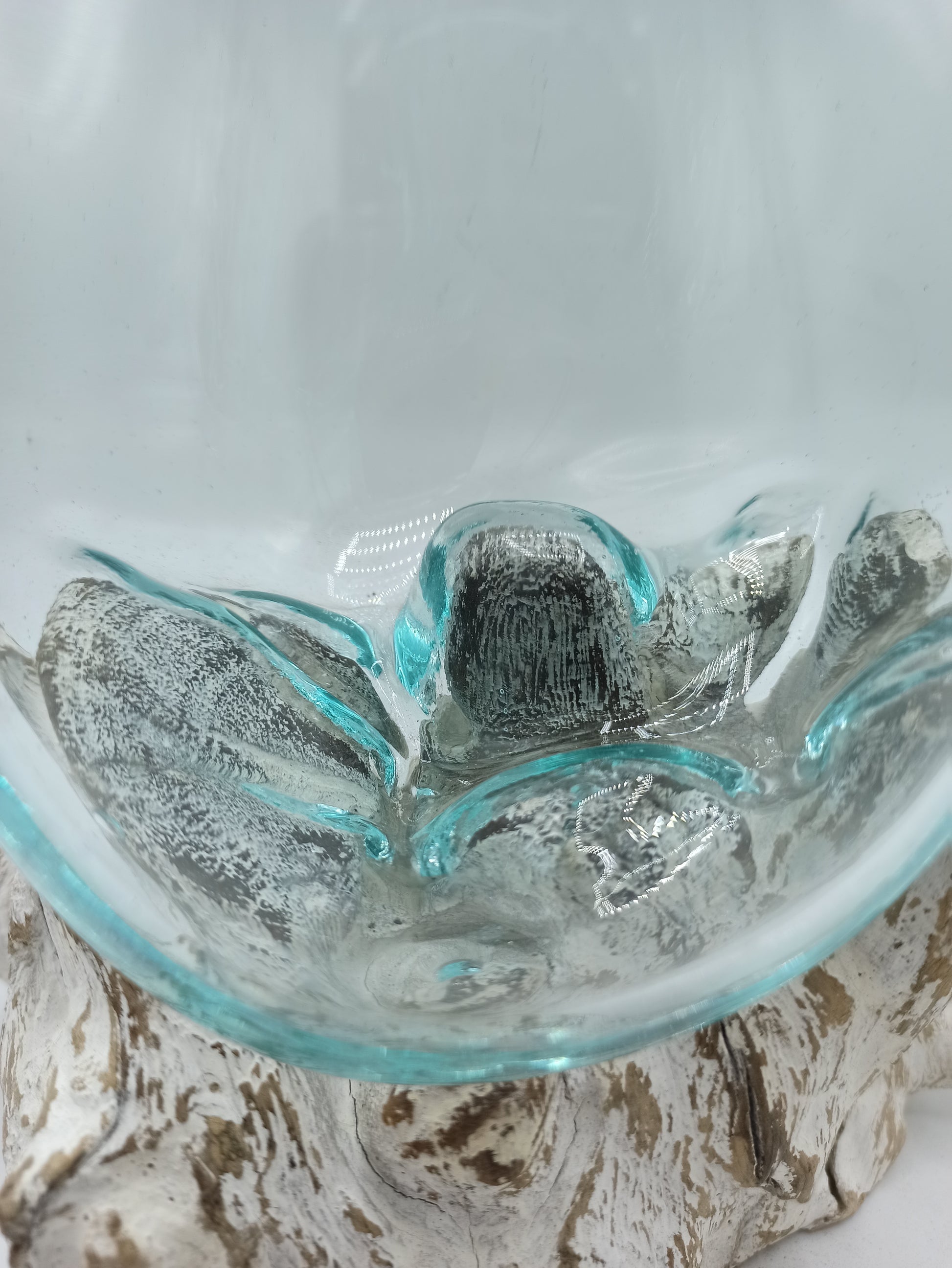 Présentant une fusion parfaite d'éléments organiques et artistiques, le bol moyen en verre fusionné sur bois blanchi se présente comme une pièce maîtresse idéale pour les tables à manger, les consoles d'entrée ou tout espace méritant un accent de beauté naturelle et de design innovant.