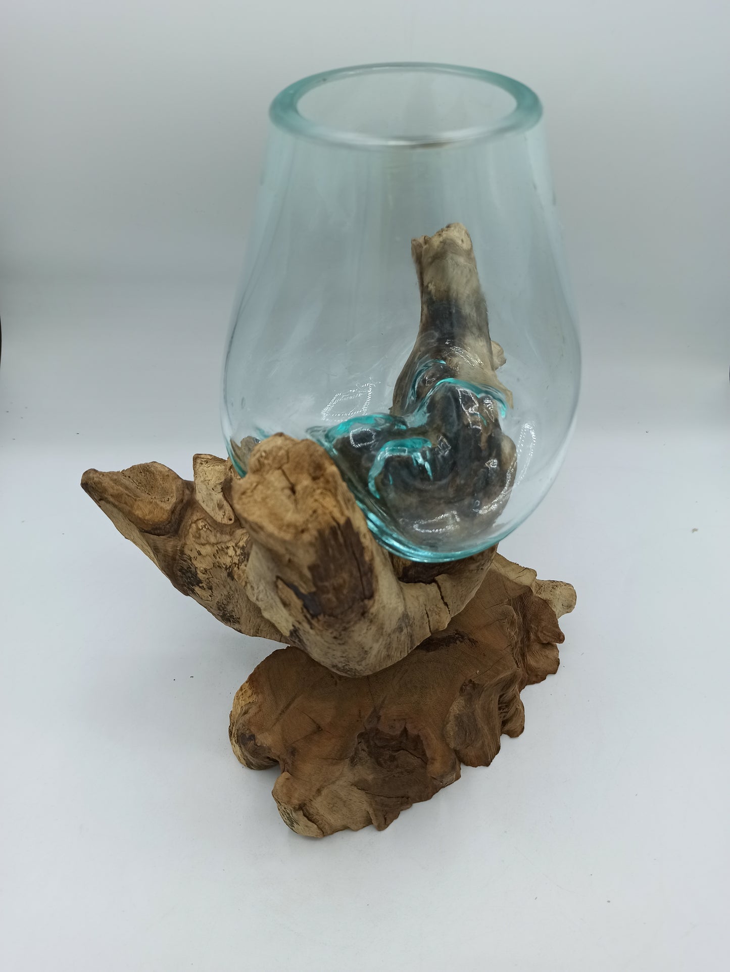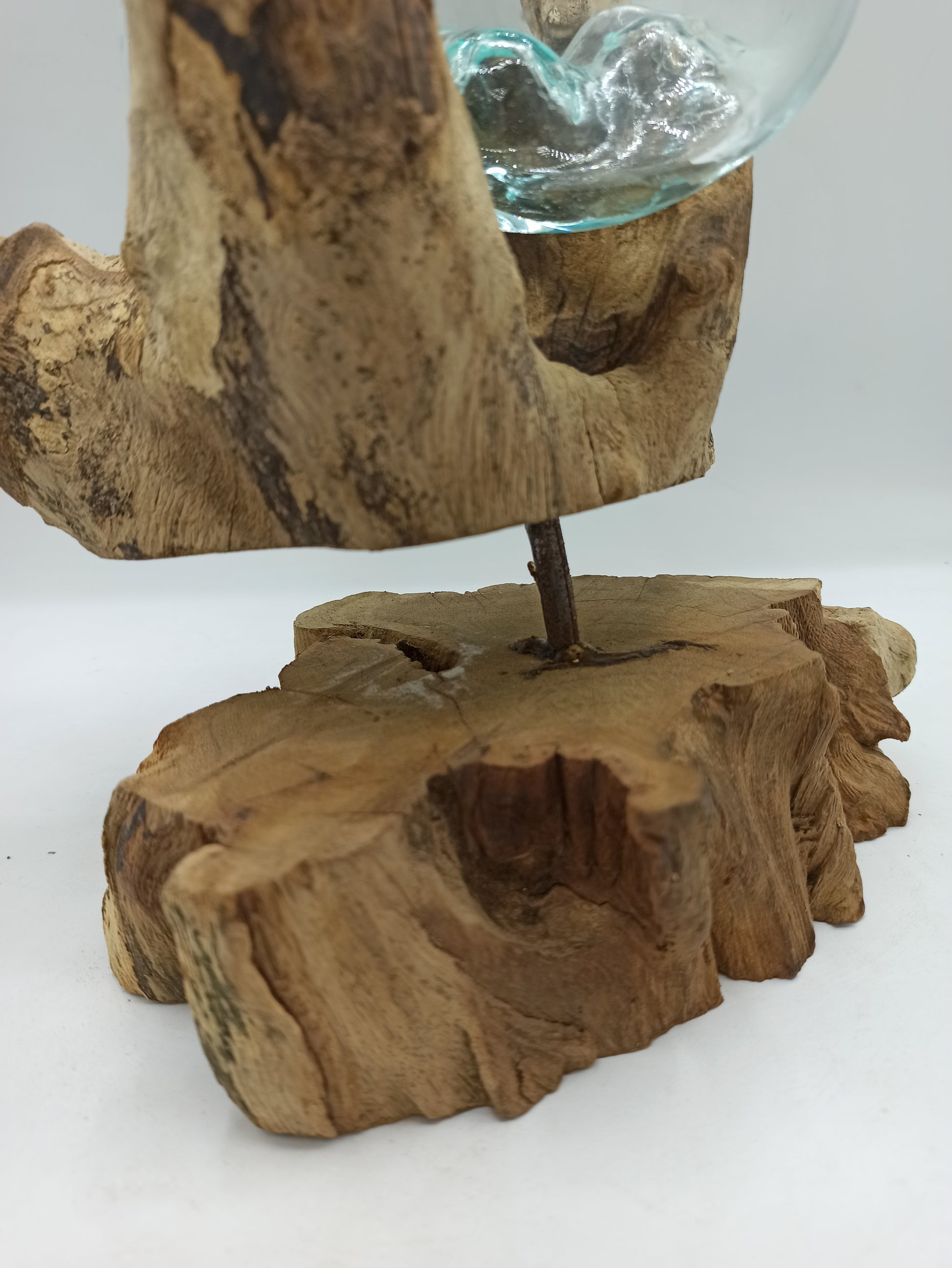 La fusion précise du verre sur le socle en bois crée un spectacle visuel époustouflant, chaque pièce devenant unique grâce aux variations naturelles du bois et aux formes spontanées du verre. Ainsi, chaque bol non seulement embellit votre espace, mais raconte aussi une histoire de beauté naturelle et de création artisanale.